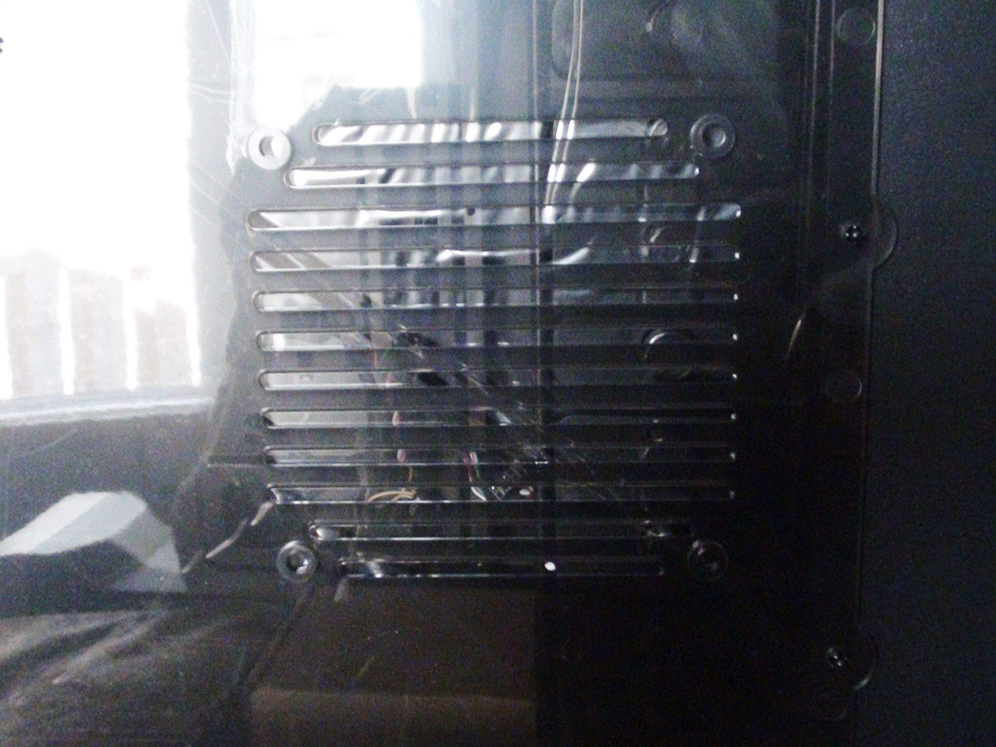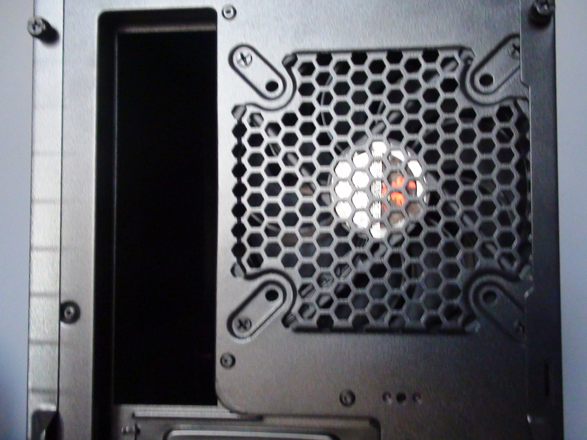 On to the back of the chassis, we see the motherboard I/O cut-out, a 120mm rear-exhaust fan (with compatibility for a smaller 92mm fan for extra motherboard clearance), seven, yes, SEVEN PCI-E expansion slots, large mesh perforations and two rubber grommets for looping tubes and cables through (primarily for water-cooling), and the bottom PSU-mount opening: