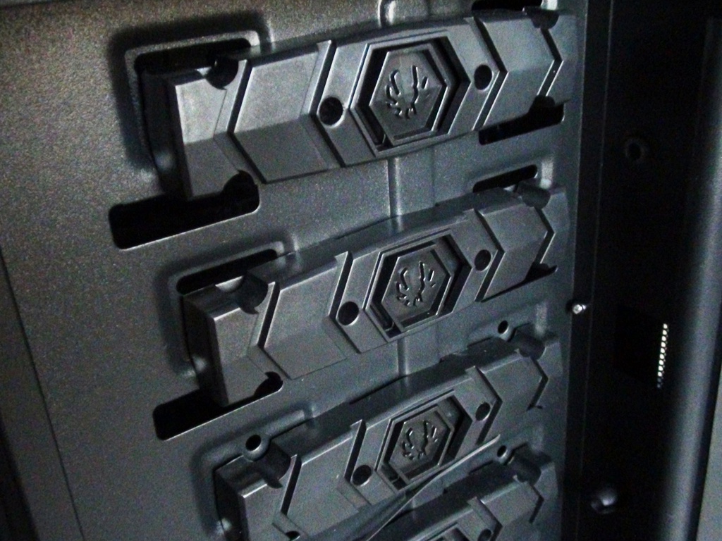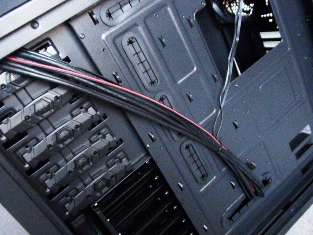 Speaking of that, the other side of the XL provides a closer look at the optical and hard drive bays, the various wire routing areas, the front 230mm fan, and the large motherboard cut-out for CPU heatsink installation. Keep in mind that the motherboard tray cannot be removed: