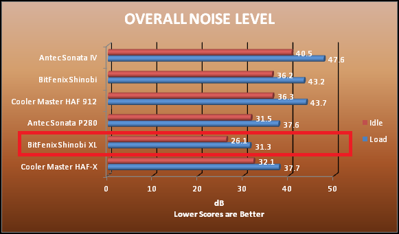The ambient temperature was 22°C. The sound levels were also recorded before, during, and after these tests. The Shinobi XL made barely a whisper of noise: