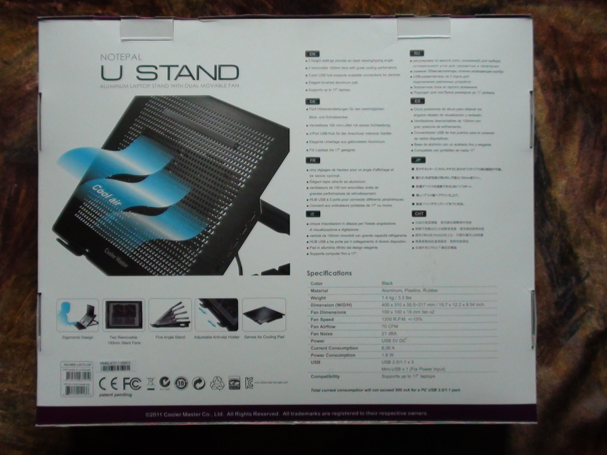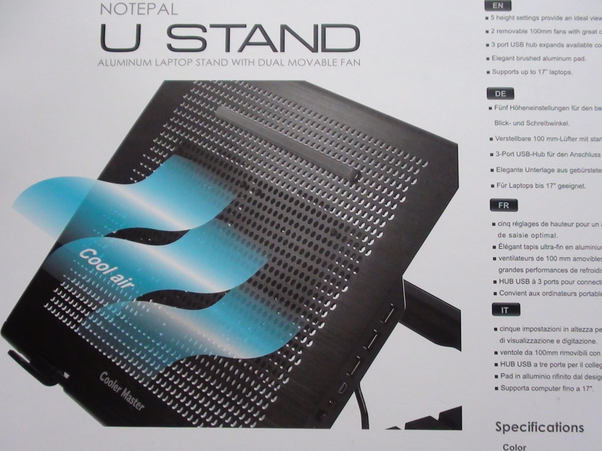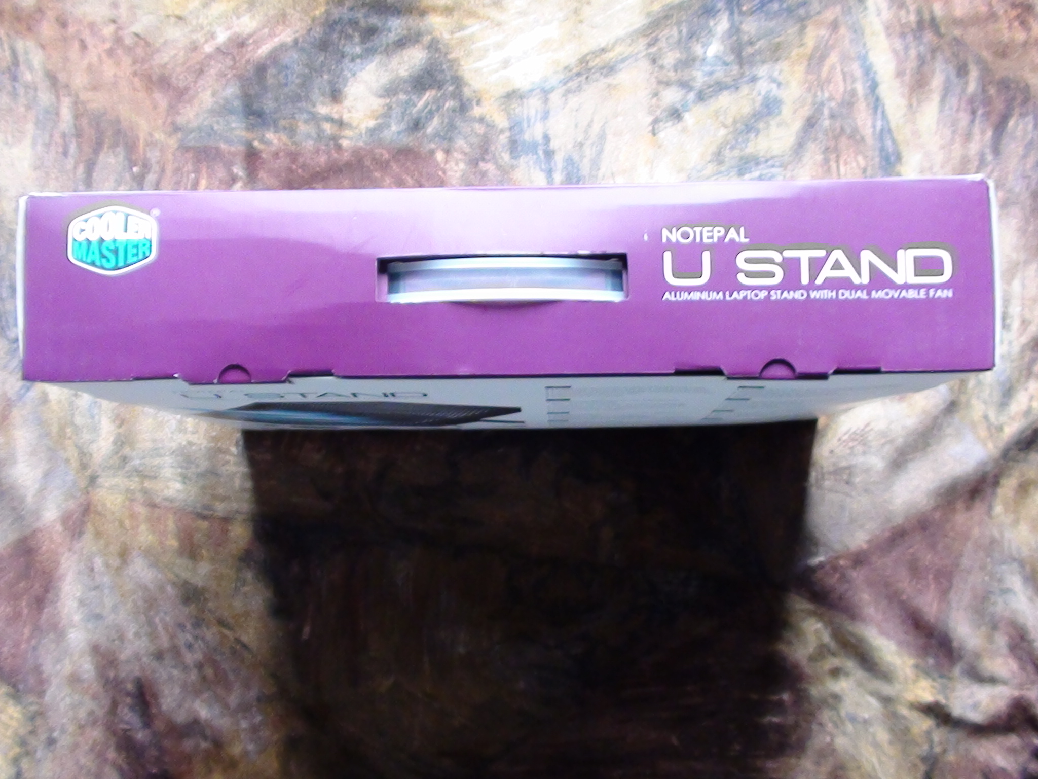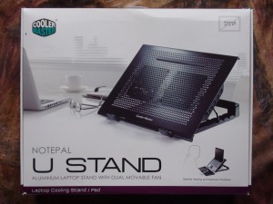 Lets take a quick look at the packaging. The front of the U Stand box has the typical solid white and purple colors, indicative of Cooler Masters design. There is also a large shot of the U Stand itself with a notice that it supports up to 17 laptops: