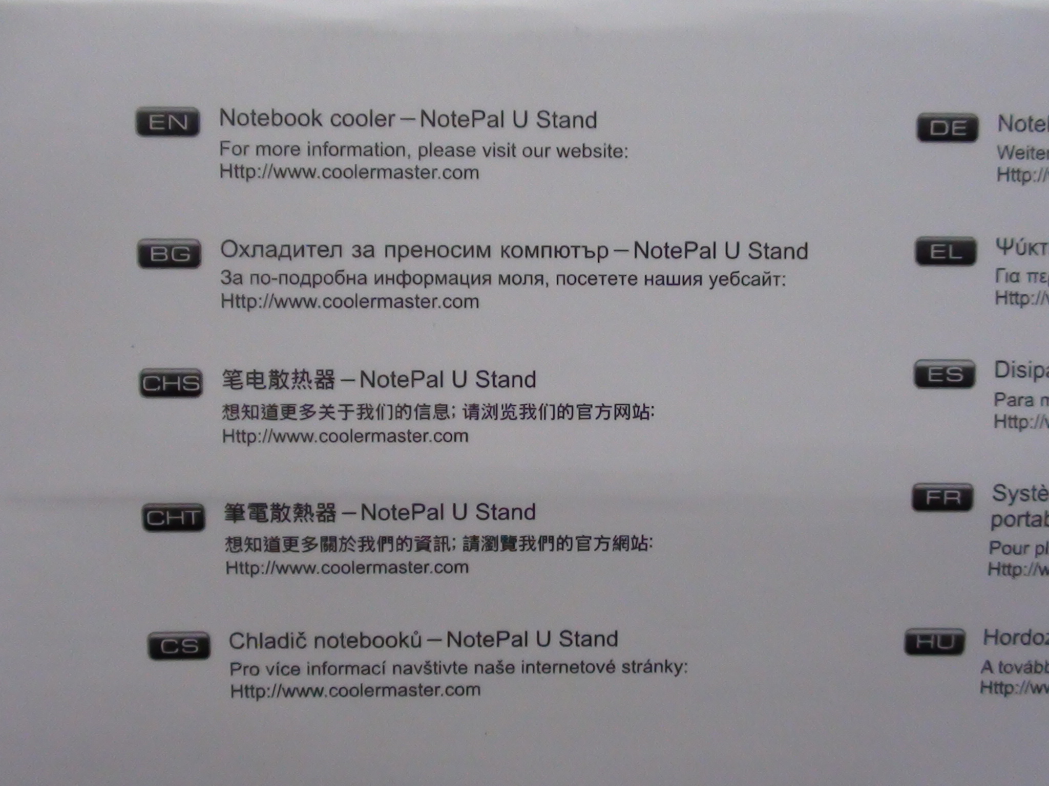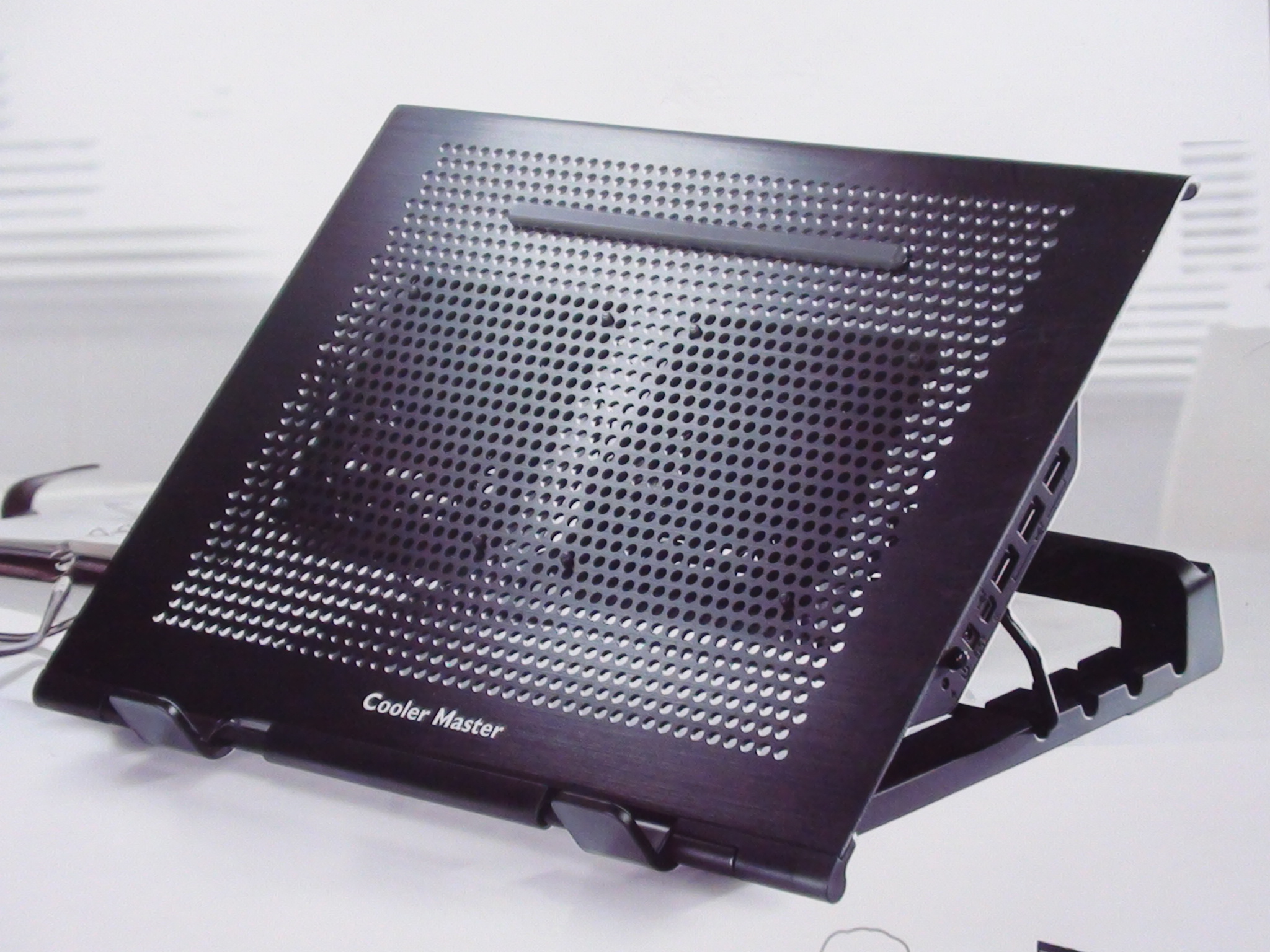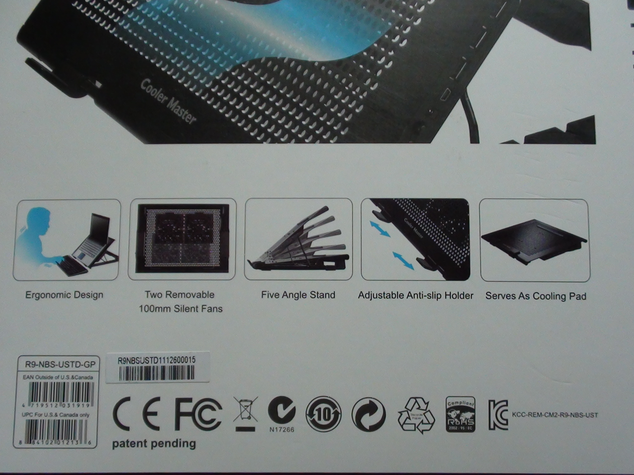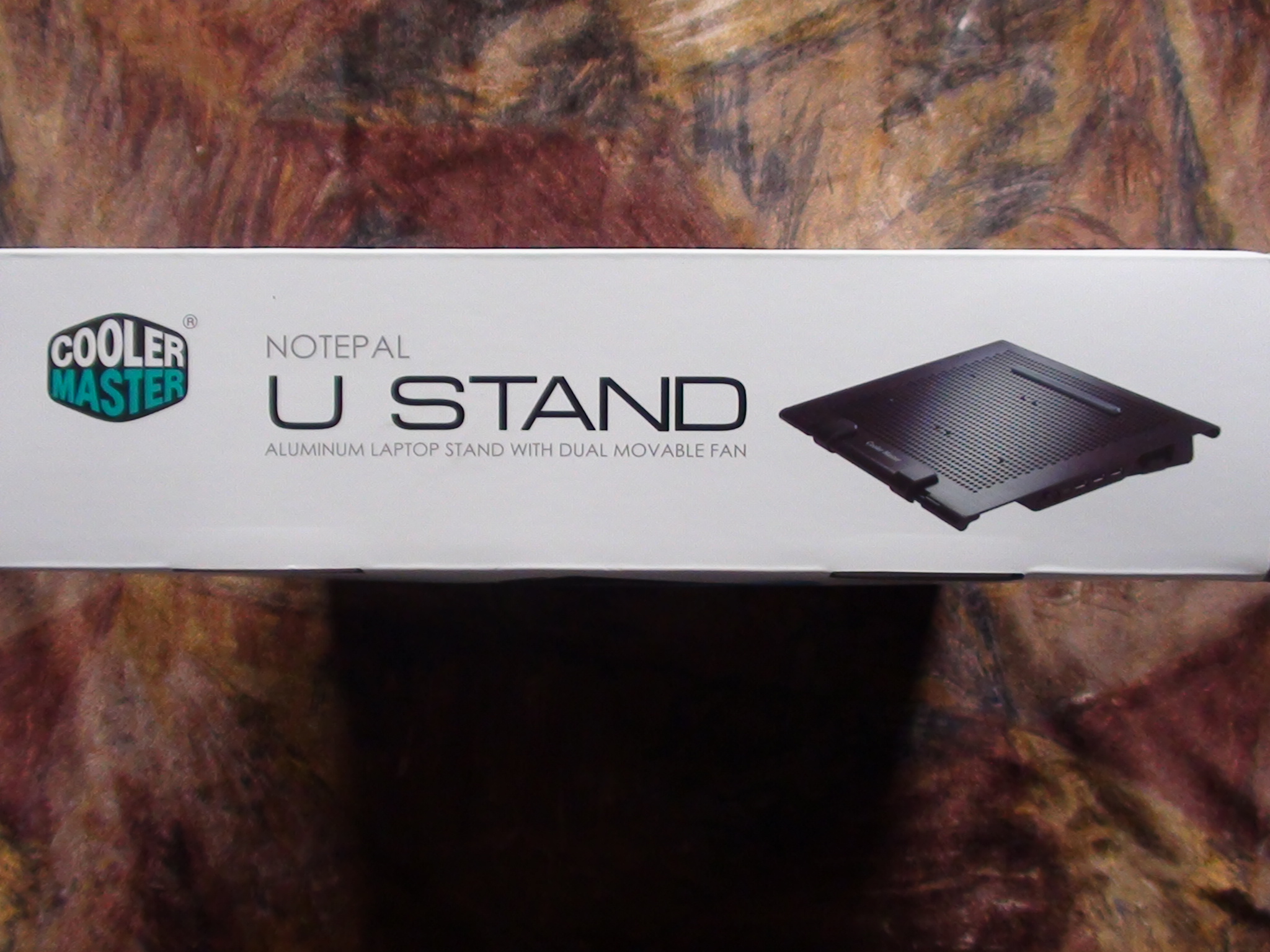 Lets take a quick look at the packaging. The front of the U Stand box has the typical solid white and purple colors, indicative of Cooler Masters design. There is also a large shot of the U Stand itself with a notice that it supports up to 17 laptops: