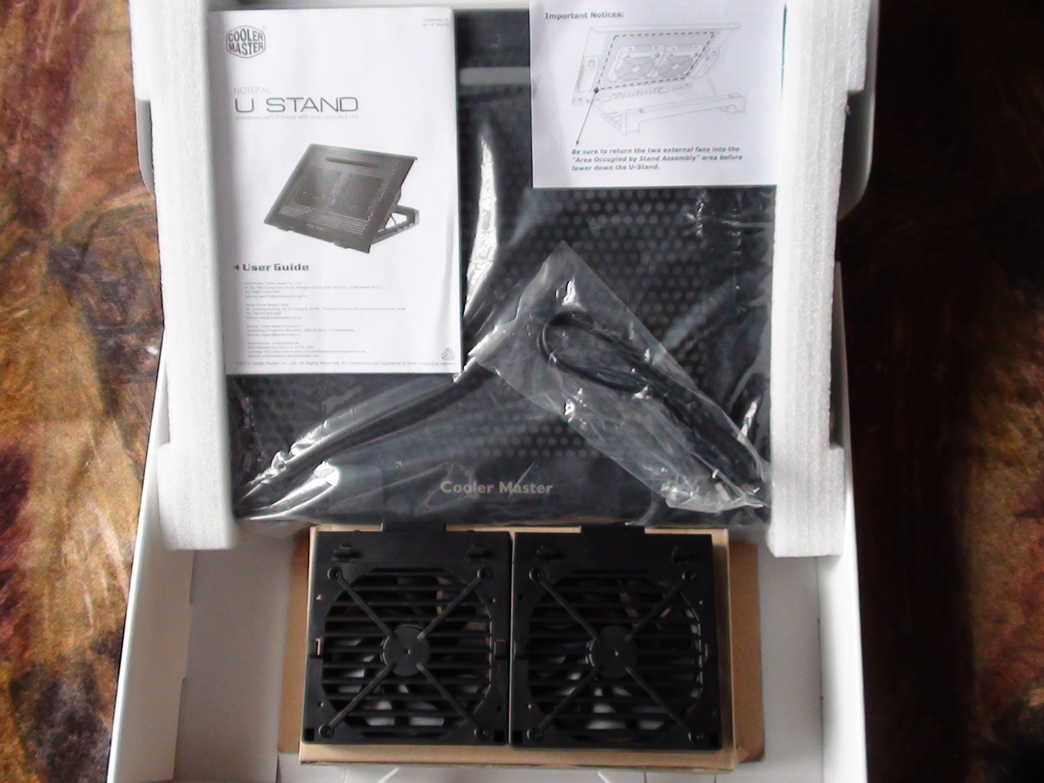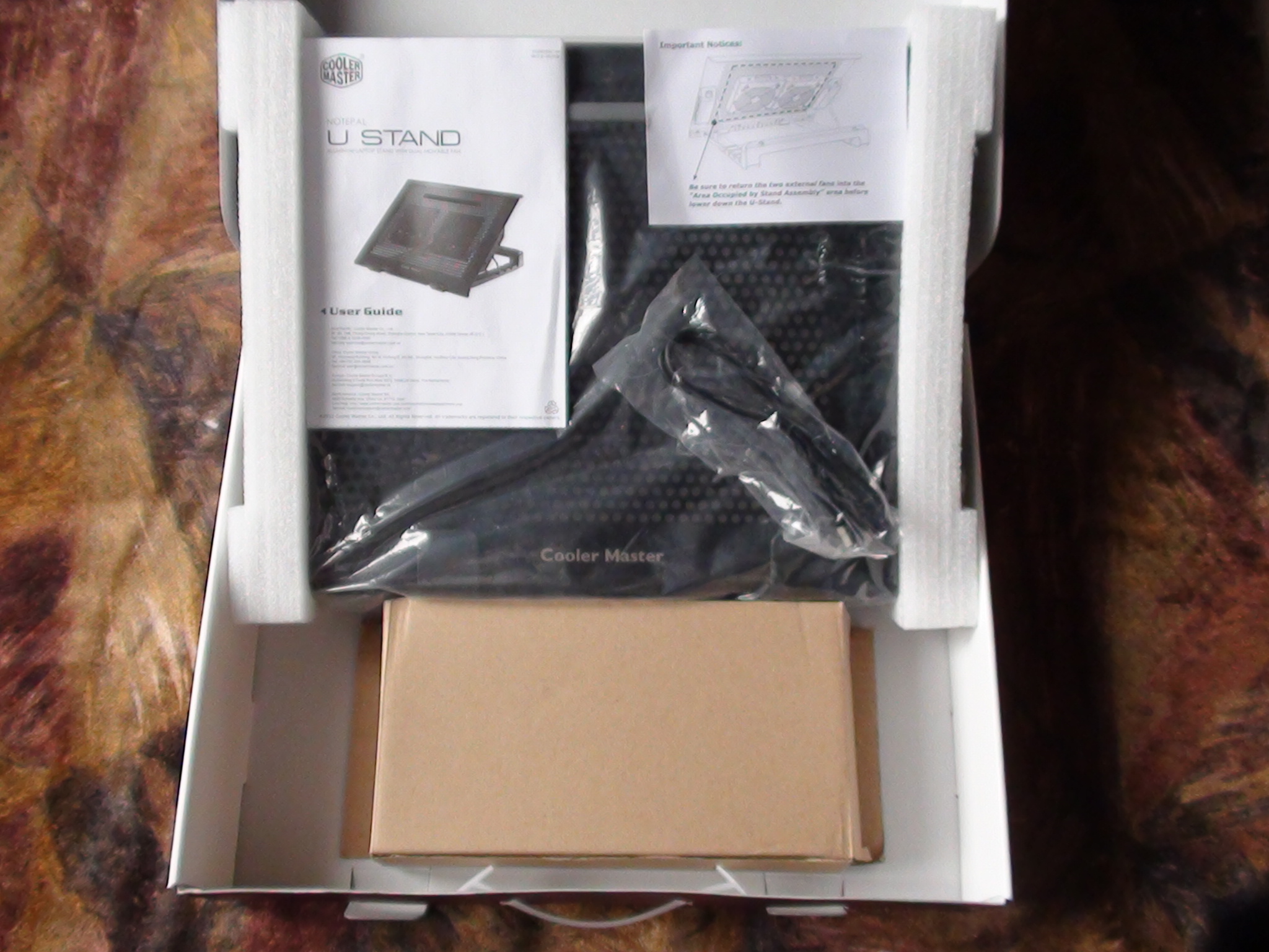 Opening the box, we see the accessories inside. There is manual, a notice, a mini-USB cord, a small box containing two 100mm fans, and the U Stand itself: