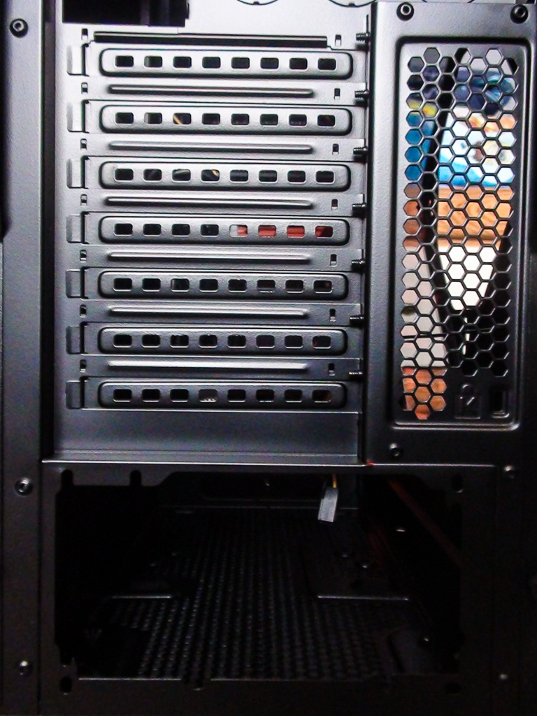 Seven PCI expansion slots are available, with a ventilation grill next to them, which also includes a locking mechanism great for protecting the case at places such as LAN parties. Finally, the power-supply area graces its usual spot at the very bottom.
