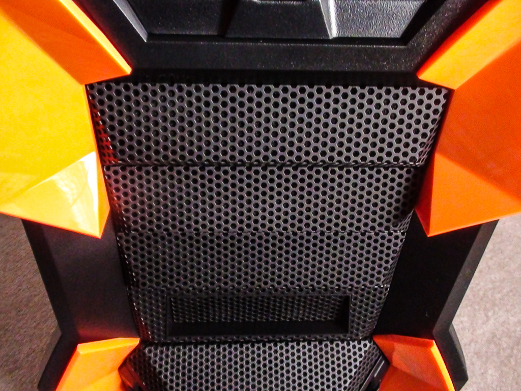 Starting off the tour, the front has three 5.25″ drive bays, as well as a 3.5″ expansion. Underneath that resides a massive 200mm fan. This entire area is covered by an air-filtered mesh panel covering which looks and feels great, and can be easily removed from the bottom:
