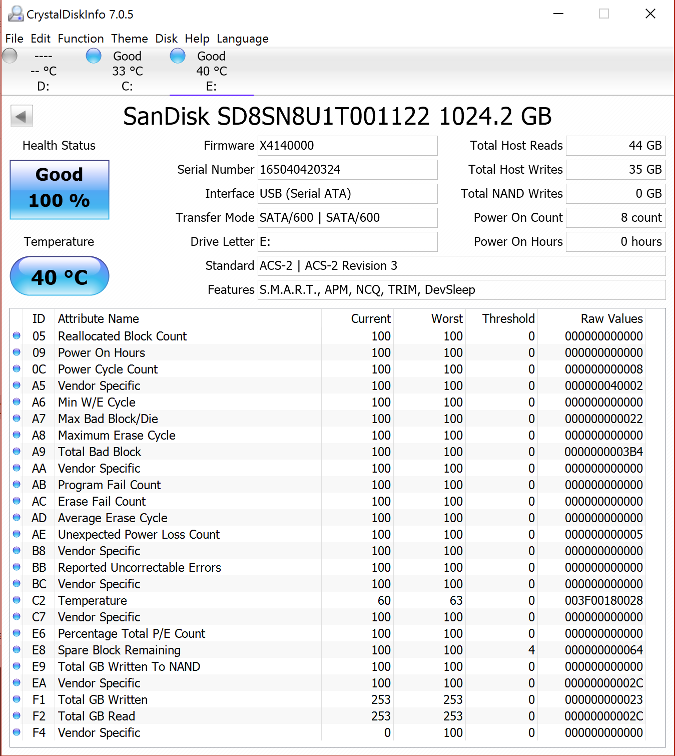 Crystal Disk Info is a great tool for displaying the characteristics and health of storage devices. It displays everything from temperatures, to the number of hours the device has been powered, and even to the extent of informing you of the firmware of the device.
