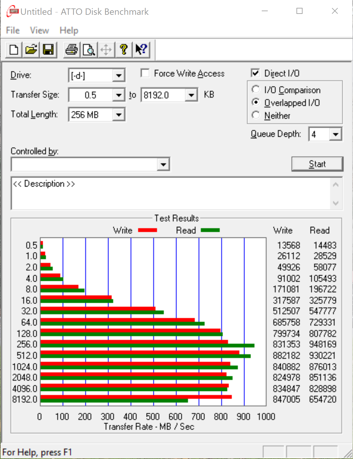 Transfer speed highs achieved through ATTO display 948MB/s read and 882MB/s write transfer speeds, both being well above posted specifications.