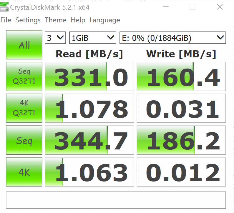 Looking at Crystal Diskmark, we can see once again that low 4K transfer speeds are not that good; we are not using this drive for small program files. 331MB/s is above spec for read speeds but 160MB/s is still a bit low for write transfer speeds.