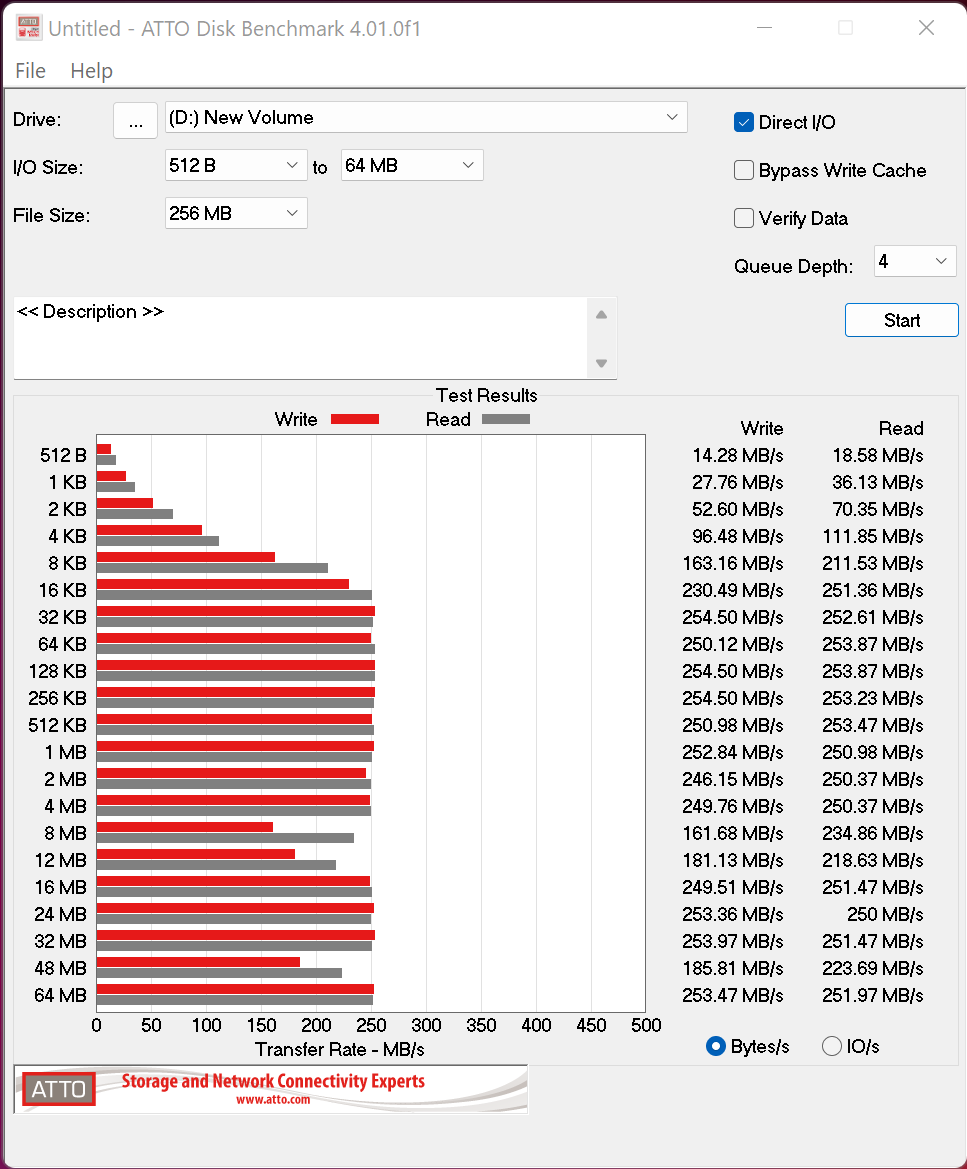 ATTO demonstrates this drives performance to top out at 253MB/s read and write which is very close to listed specs.