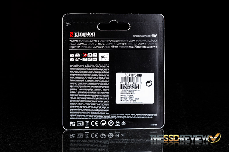 It comes in a pretty typical SD card package. On the front are the Kingston logo and a clear plastic shell holding the card for show. On the back there is the just the product SKU code and pictorial guide showing that the SDHC devices are not compatible with SDXC cards.