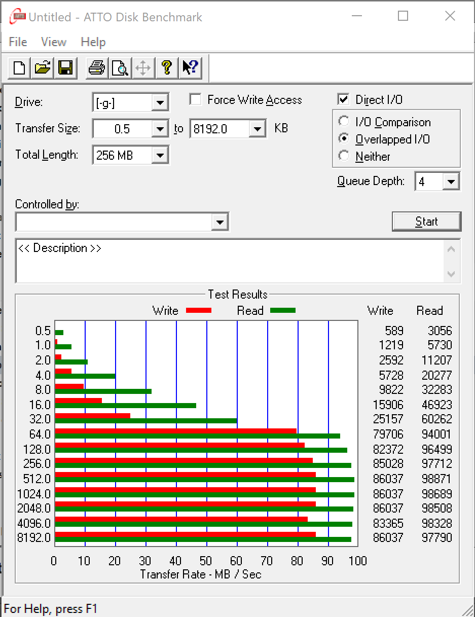 Our initial ATTO results are very strong as we see a steady progression as sample sizes increase and results are as expected at 97MB/s read and 86MB/s write.