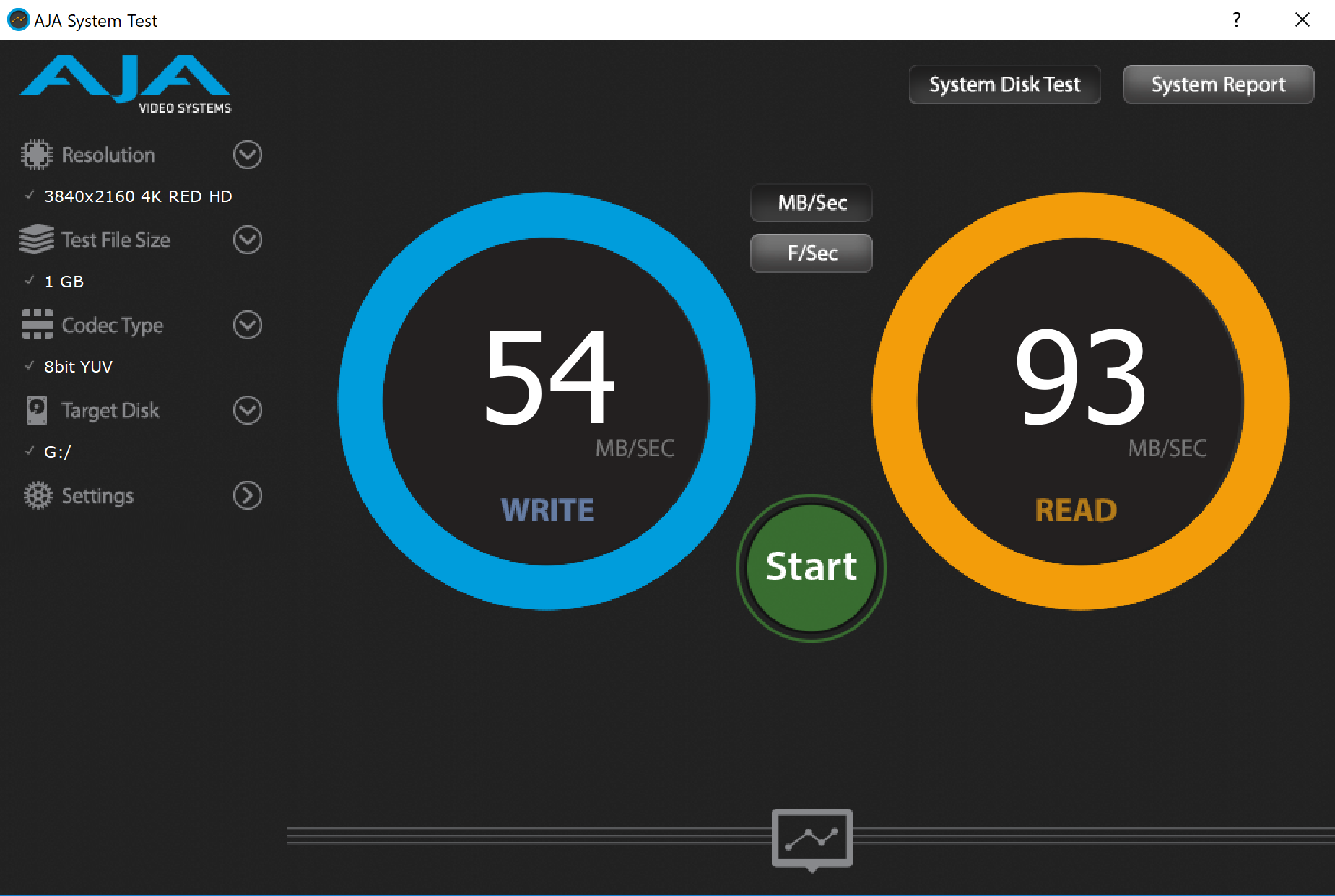 The AJA Video Systems Disk Test is relatively new to our testing and tests the transfer speed of video files with different resolutions and Codec.