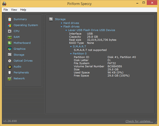 With Speccy, we can see that the Lexar P10 has a real size of 32 GB, while having a usable capacity of 29.8 GB. We also see that the drive is formatted in FAT32.
