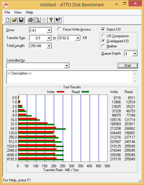 ATTO Disk Benchmark is a relatively easy-to-use benchmark tool, which happens to be the benchmark of choice for many manufacturers. ATTO uses compressible data rather than random data, which results in higher performance and thus, higher benchmark scores. In our testing, we have selected the transfer size to range from 0.5KB to 8192KB, and have set the total length of the test to be 256MB.