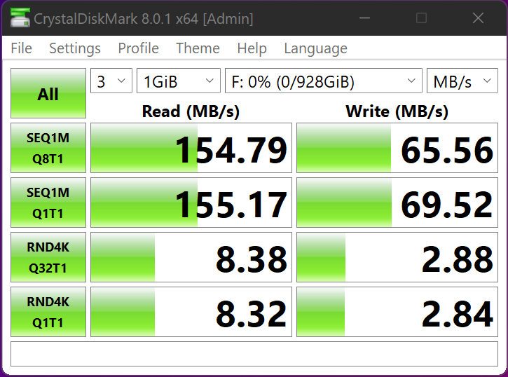 Our testing resulted in 154MB/s read and 65MB/s write in a card that has been in use for months. The card is rated at V30/U3, meaning video recording of at least 30MB/s, as well as the A2 designation as it will reach speeds up to 160MB/s.