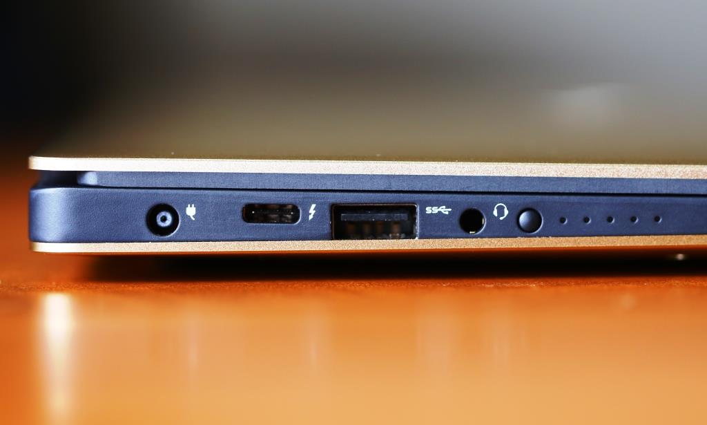 Exterior casing is a simple black cardboard box with minimal paperwork and the power cord and adapter; drivers are available via the net. The left side of the XPS 13 contains ports for power, Thunderbolt 3/USB Type-C, USB 3 SuperSpeed, headphones and a button with five LEDs that indicates remaining battery life, when the button is pressed.