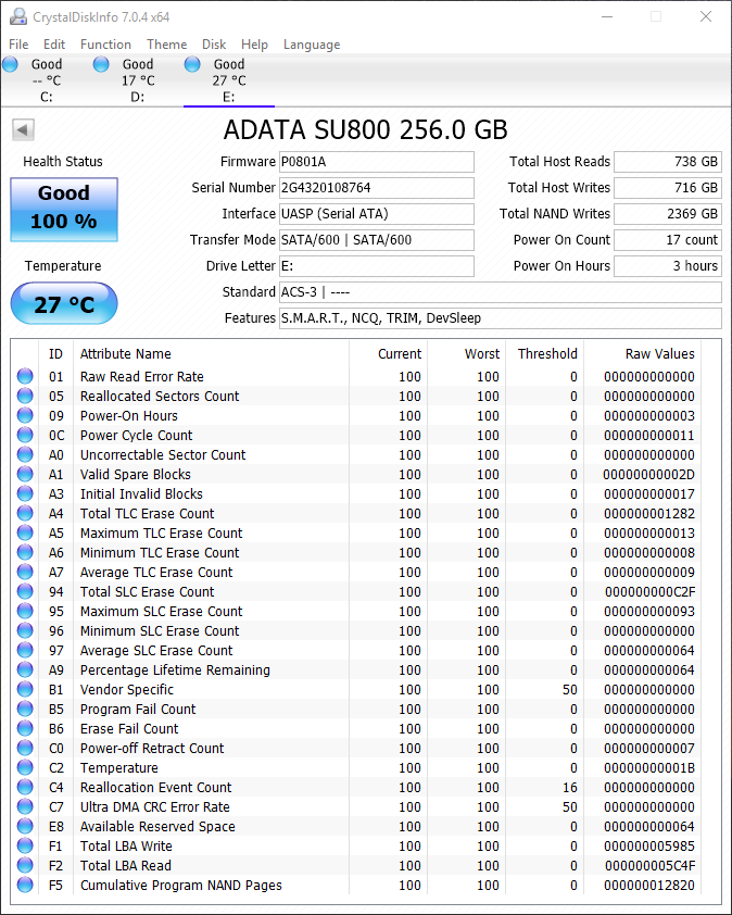 Crystal Disk Info is a great tool for displaying the characteristics and health of storage devices. It displays everything from temperatures, to the number of hours the device has been powered, and even to the extent of informing you of the firmware of the device.