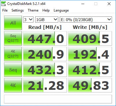 Our first results are very good, almost in line with the listed read/write speeds of up to 440 MB/s – the lower results could be attributed to the usage prior to us obtaining the drive.