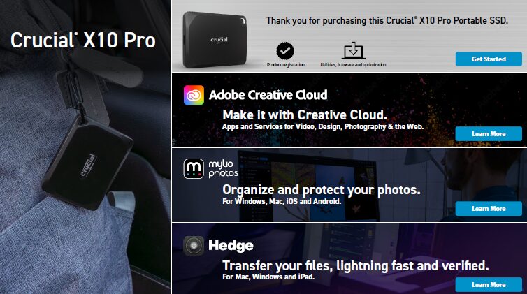 The Crucial X10 Pro also includes added software unavailable with the base model to include Adobe Creative Cloud All Apps Plan and Hedge File Transfer utilities. So to be perfectly clear, that few extra dollars is getting you a better warranty, full disk encryption, password protection, better software and we might believe a bit better sustained write perfdormance which we will get to.