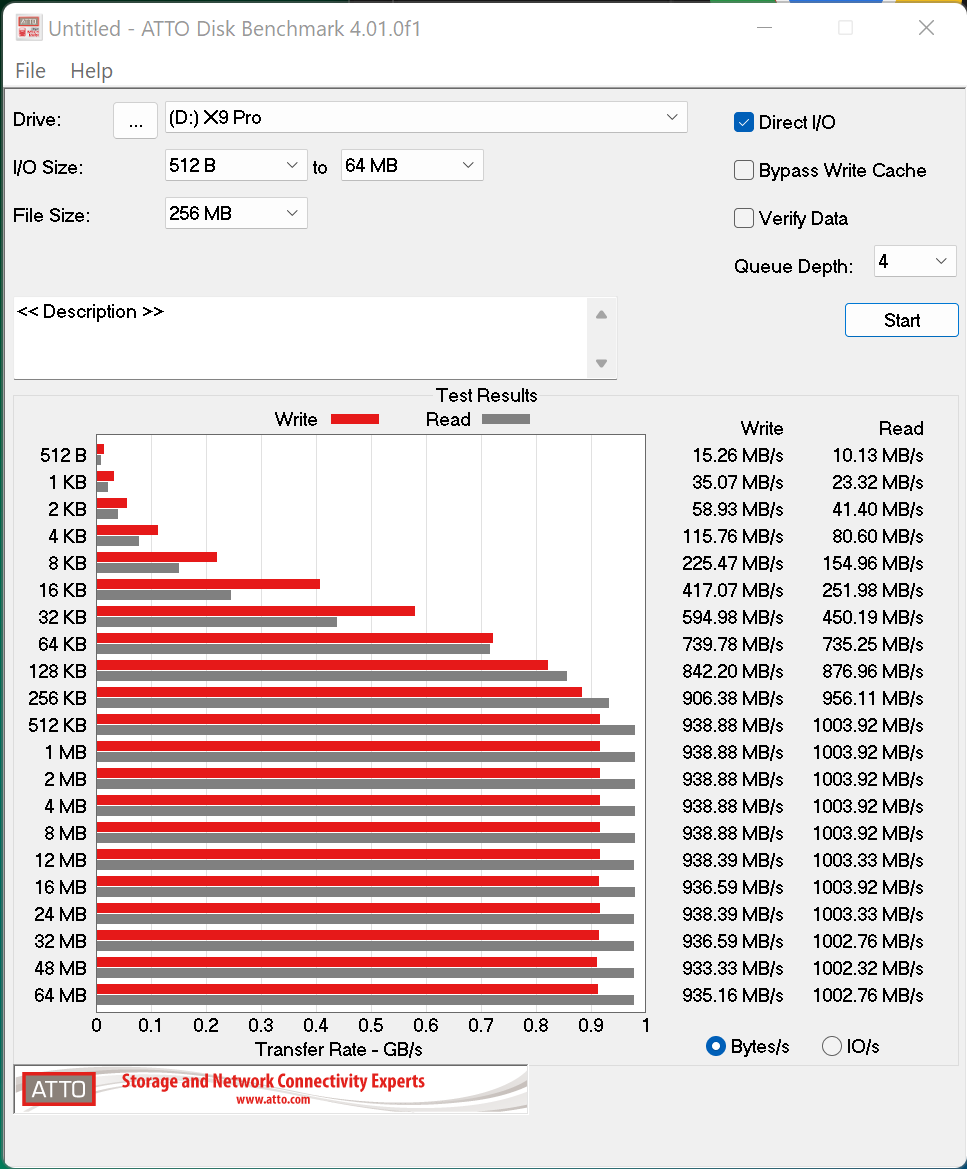 The Crucial X9 Pro provided speed results of 1002MB/s read and 935MB/s write which are completely acceptable for this software. We can see a gradual performance progression as data sizes increase which we have always found to be the sign of a very solid storage device.