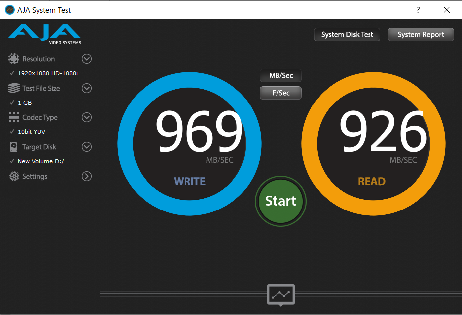 The AJA Video Systems Disk Test is relatively new to our testing and tests the transfer speed of video files with different resolutions and Codec.