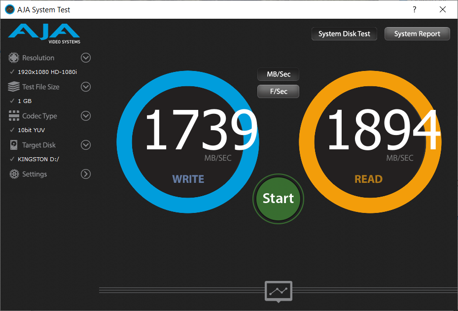 The AJA Video Systems Disk Test is relatively new to our testing and tests the transfer speed of video files with different resolutions and Codec.