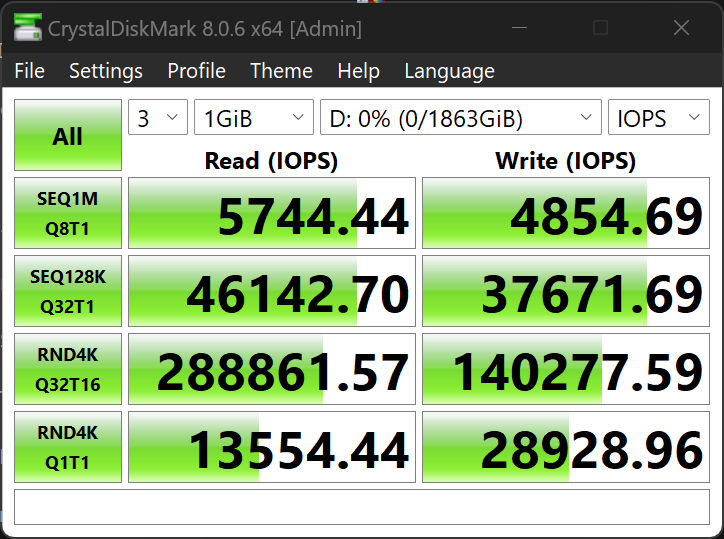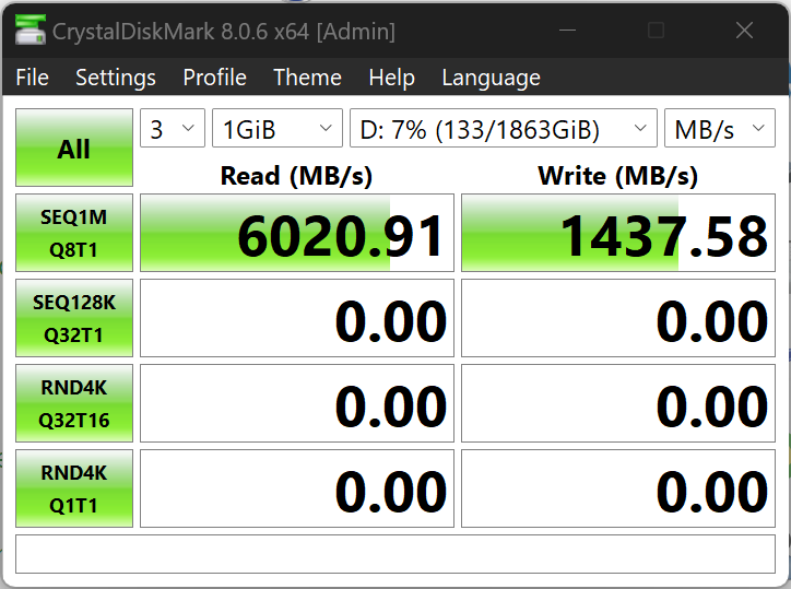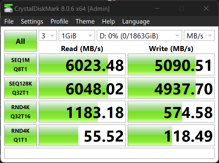 Although listed specifications call for a high speed of 6700MB/s, we were only able to achieve 6023MB/s. This was our reasoning for checking other reviews, only to learn there hadn’t been another even reaching 6GB/s as of yet. As well, LaCie has been very transparent in the fact that this SSD contains a 50GB cache and that , once the cache is full, data transfer write speeds drop to 1400MB/s on the 2TB and 1800MB/s on the 4TB version. Crystal Diskmark confirmed this for us.