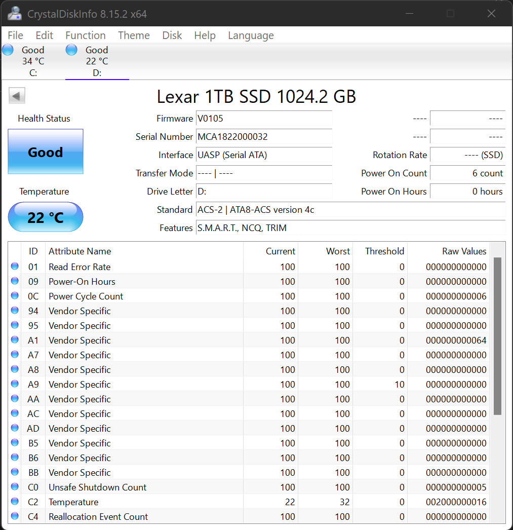 Crystal Disk Info is a great tool for displaying the characteristics and health of storage devices. It displays everything from temperatures, the number of hours the device has been powered, and even to the extent of informing you of the firmware of the device.