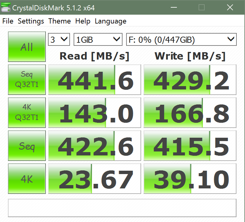 PNY listed sequential performance number of 430MB/s read and 400MB/s write and, as we can see here, we are off to a great start! Parallel 460MB/s speeds are great to see, considering this device is so compact.