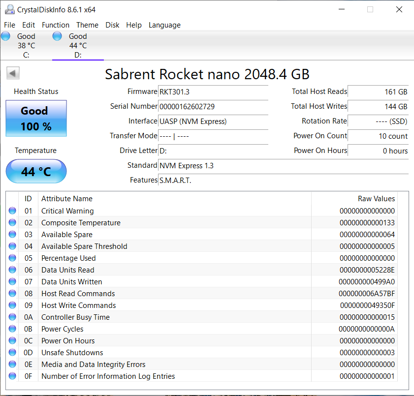 A quick look at our Crystal DiskInfo result shows that this SSD uses the UASP interface ( USB Attached SCSI Protocol) and is compliant with the NVMe 1.3 protocol.