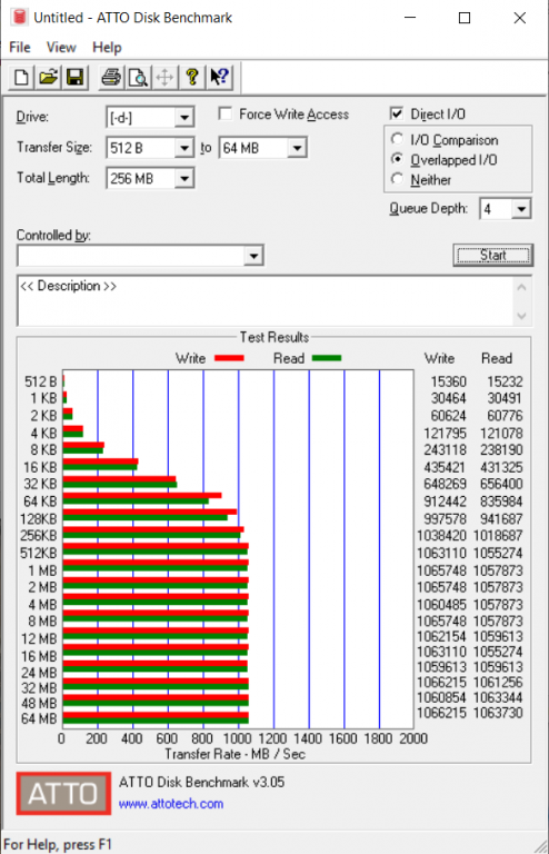 ATTO Disk Benchmark is perhaps one of the oldest benchmarks going and is definitely the main staple for manufacturer performance specifications. ATTO uses RAW or compressible data and, for our benchmarks, we use a set length of 256mb and test both the read and write performance of various transfer sizes ranging from 512b to 65mb. Manufacturers prefer this method of testing as it deals with raw (compressible) data rather than random (includes incompressible data) which, although more realistic, results in lower performance results.