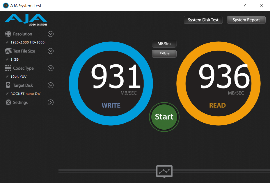 The AJA Video Systems Disk Test is relatively new to our testing and tests the transfer speed of video files with different resolutions and Codec.
