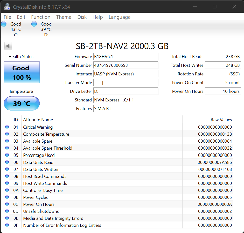 Crystal Disk Info is a great tool for displaying the characteristics and health of storage devices. It displays everything from temperatures, the number of hours the device has been powered, and even to the extent of informing you of the firmware of the device.