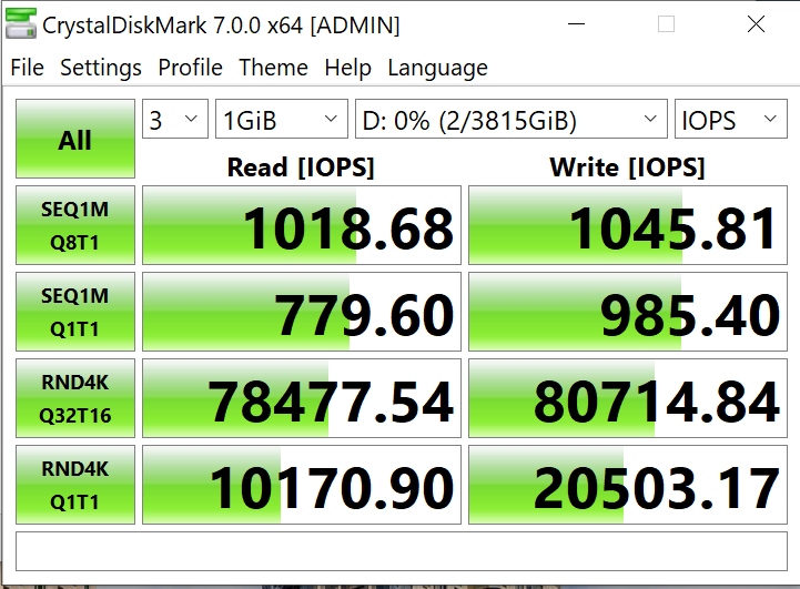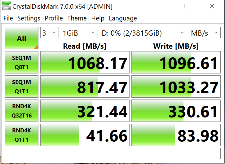 Crystal DiskMark results are as expected with both read and write speeds being just over 1GB/s.