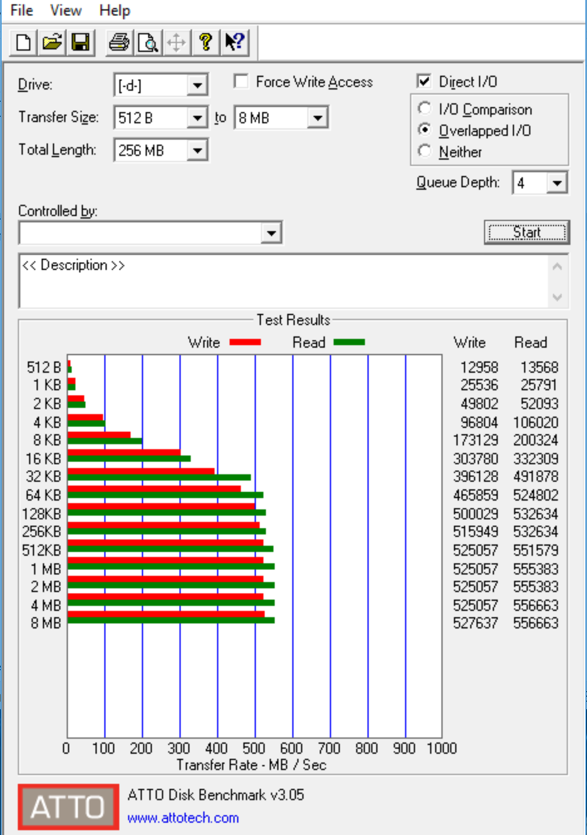 ATTO Disk Benchmark is perhaps one of the oldest benchmarks going and is definitely the main staple for manufacturer performance specifications. ATTO uses RAW or compressible data and, for our benchmarks, we use a set length of 256mb and test both the read and write performance of various transfer sizes ranging from 0.5 to 8192kb. Manufacturers prefer this method of testing as it deals with raw (compressible) data rather than random (includes incompressible data) which, although more realistic, results in lower performance results.