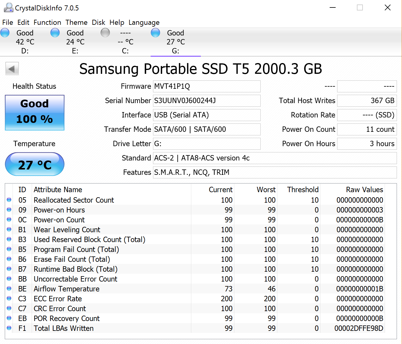 Crystal Disk Info is a great tool for displaying the characteristics and health of storage devices. It displays everything from temperatures, the number of hours the device has been powered, and even to the extent of informing you of the firmware of the device.