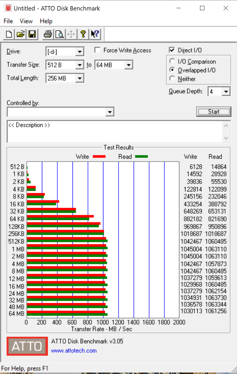 Our initial ATTO Benchmark is very encouraging as the SanDisk Extreme Portable SSD meets listed performance specifications and we see a gradual increase in speed with increase of sample size transferred.