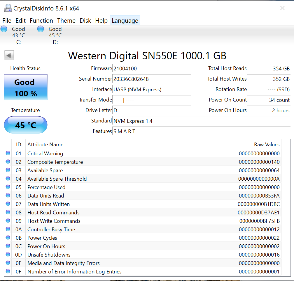 Examining the Crystal DiskInfo result, we can validate that the SanDisk Extreme Portable SSD is based on the Western Digital Blue SN550 NVMe SSD and is using the newest NVMe 1.4 protocol.
