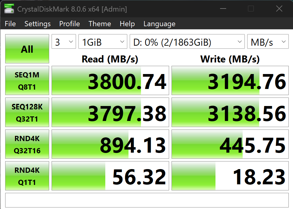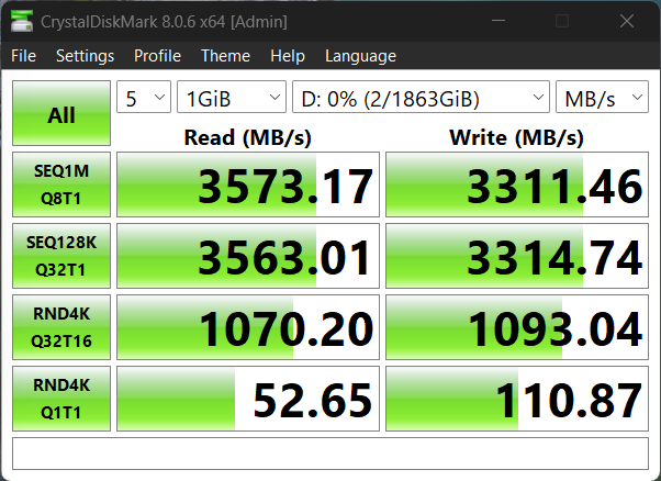 Speeds of 3.5GB/s read and 3.3GB/s write are respectable considering we are so early into the implementation stage of USB4. We wanted to see the result of this in our USB 4 laptop where we were able to achieve that listed 3.8GB/s data throughput but at a cost of lower random performance. This may seem ‘to stand out’ but for most, the pure reasoning for getting a USB4 portable SSD is to manipulate media which the high sequential speeds typically account for. Most don’t ever consider but those low random speeds, for the most part, are needed for very small 4K system execution files which you wouldn’t run from any external SSD. Take a look.