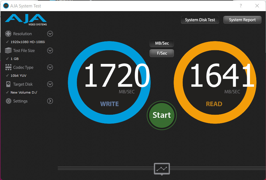 The AJA Video Systems Disk Test is relatively new to our testing and tests the transfer speed of video files with different resolutions and Codec.
