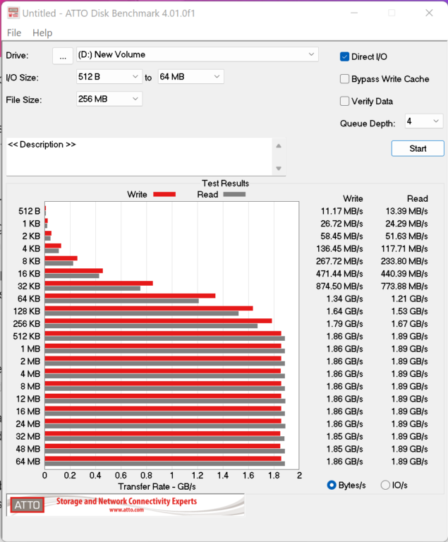 ATTO Disk Benchmark is perhaps one of the oldest benchmarks going and is definitely the main staple for manufacturer performance specifications. ATTO uses RAW or compressible data and, for our benchmarks, we use a set length of 256mb and test both the read and write performance of various transfer sizes ranging from 0.5 to 8192kb. Manufacturers prefer this method of testing as it deals with raw (compressible) data rather than random (includes incompressible data) which, although more realistic, results in lower performance results.