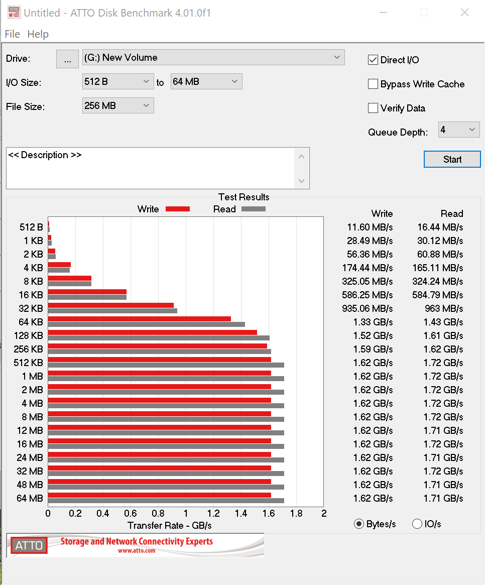 ATTO Disk Benchmark is perhaps one of the oldest benchmarks going and is definitely the main staple for manufacturer performance specifications. ATTO uses RAW or compressible data and, for our benchmarks, we use a set length of 256mb and test both the read and write performance of various transfer sizes ranging from 0.5 to 8192kb. Manufacturers prefer this method of testing as it deals with raw (compressible) data rather than random (includes incompressible data) which, although more realistic, results in lower performance results.