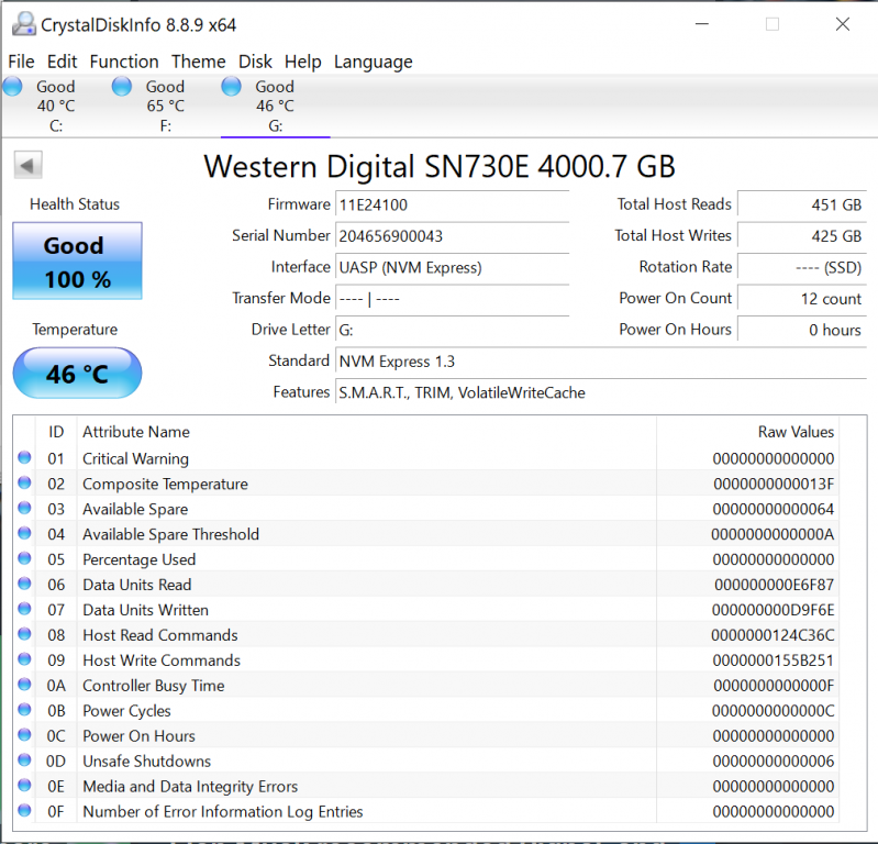 Crystal Disk Info is a great tool for displaying the characteristics and health of storage devices. It displays everything from temperatures, the number of hours the device has been powered, and even to the extent of informing you of the firmware of the device.