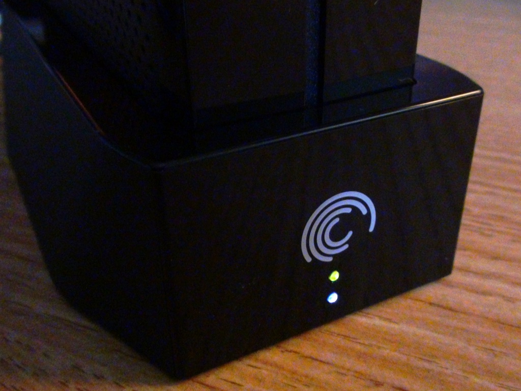 The inputs in the back contain a high-speed ethernet port, a USB port, and a port for the power brick. There is also a push button to turn the drive on/off. An obvious absence is a USB output port for data transfer in case something happens to the ethernet port, or the GoFlex base. However, one could use a SATA/eSATA cable and connect with the inputs located underneath the GoFlex drive (the same connectors jutting out from the GoFlex base). Keep in mind that the GoFlex does not have built-in wireless capabilities. Once everything is ready, a solid green indicator LED will reveal itself, with a similar white LED at the bottom indicating that the drive is connected: