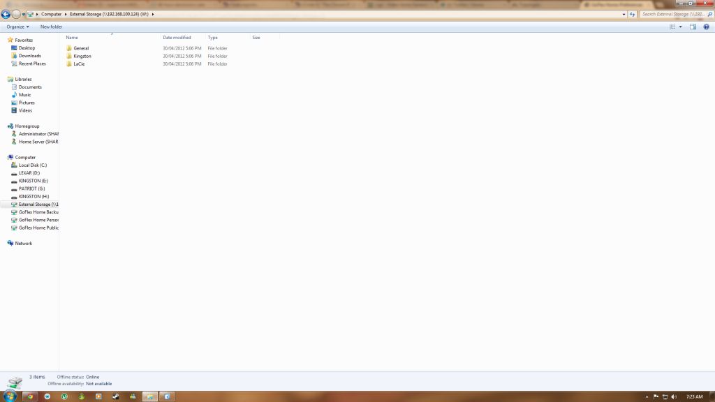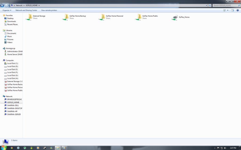 The software also maps the drive into three categories automatically (Backup, Personal, Public), and a fourth should you add a storage device/devices via USB (External Storage) The drive mapping, however, can be done manually as well without the software. The GoFlex will present itself over the network as a UPNP device, at which point double-clicking it will install a storage driver, which will then allow root access to the device: