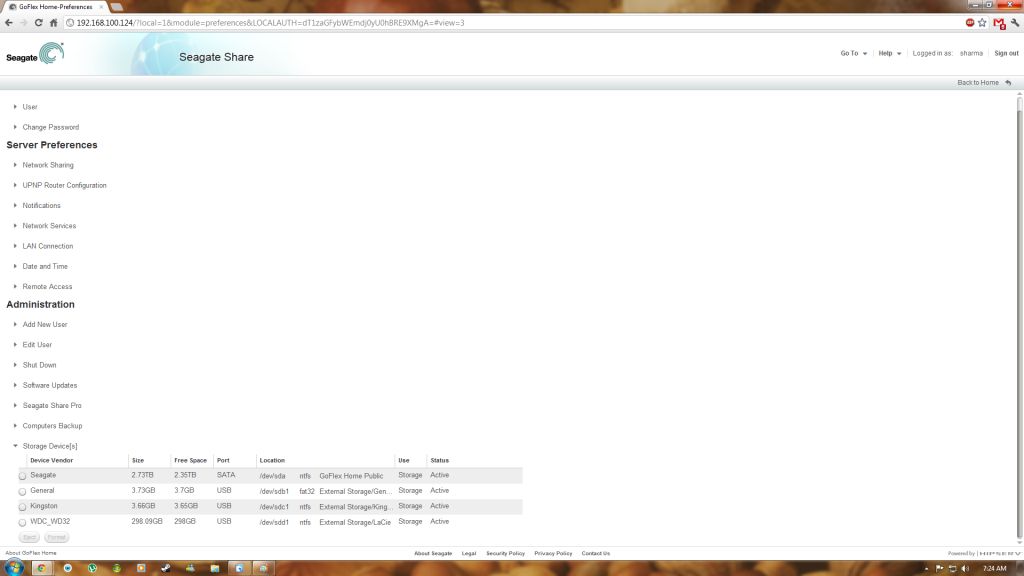 The options in the Seagate Dashboard will take you to an online, browser-based GUI running off the GoFlex with the provided IP by your router (in my case, 192.168.100.124). There are a plethora of options here, including the ability to upgrade firmware. Keep in mind however, that when making changes to the GoFlex, any disruptions in the process can cause it to brick or become unresponsive, leading to a hard reset/firmware flash rendering a complete wipe of data. Think of the GoFlex as a router with a hard drive, and keep in mind of the same precautions: