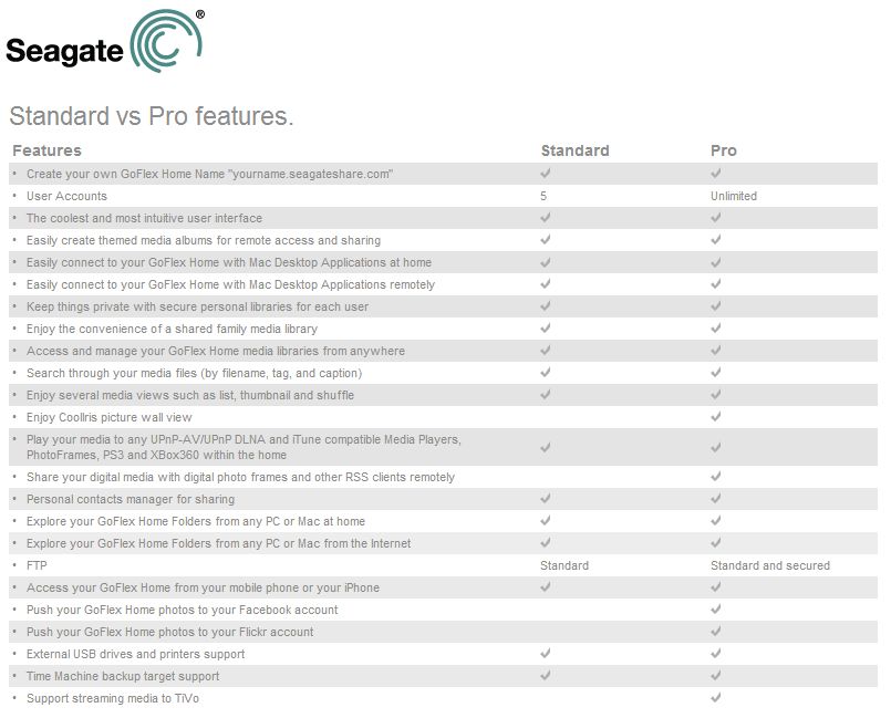 The Seagate Share software has a few drawbacks, the main one being that the standard free version only allows five users accounts, and the second being the exclusion of various features. Chances are most people will not have more than five computers, and in case that situation occurs, a user account can be reused on any machine. However, only the data on the GoFlex associated with that account will be allowed access, thus in order to create separate sharing spaces on the drive for various users, new user accounts will need to be created for each. A comparison of both services is listed below:
