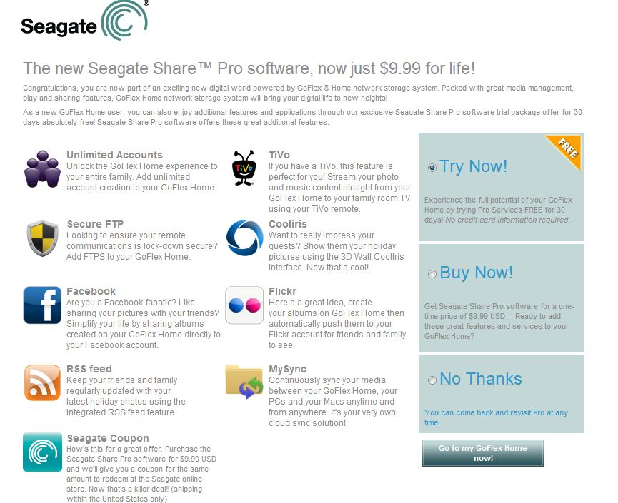 The documentation stated that the Pro version would cost $19.99/month, however a quick search reveals an update page with a new price of $9.99 for life with a free trial before you decide to buy. The Memeo Backup service costs a one-time payment of $49.95 for all devices attached to the GoFlex, with a 30-day free trial. Not too shabby of an investment considering the extra goodies: