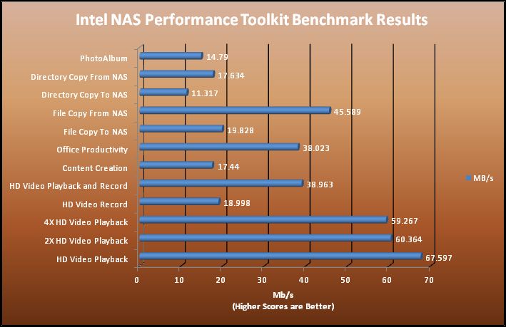 A final speed test was done using Intel’s NAS Performance Toolkit (NASPT). It is is a file system exerciser and analysis tool designed to enable performance comparisons between network attached storage (NAS) devices. NASPT focuses on user level performance using real world workload traces gathered from typical digital home applications: HD video playback and record, data backup and restore utilities, office productivity applications, video rendering/content creation and more: