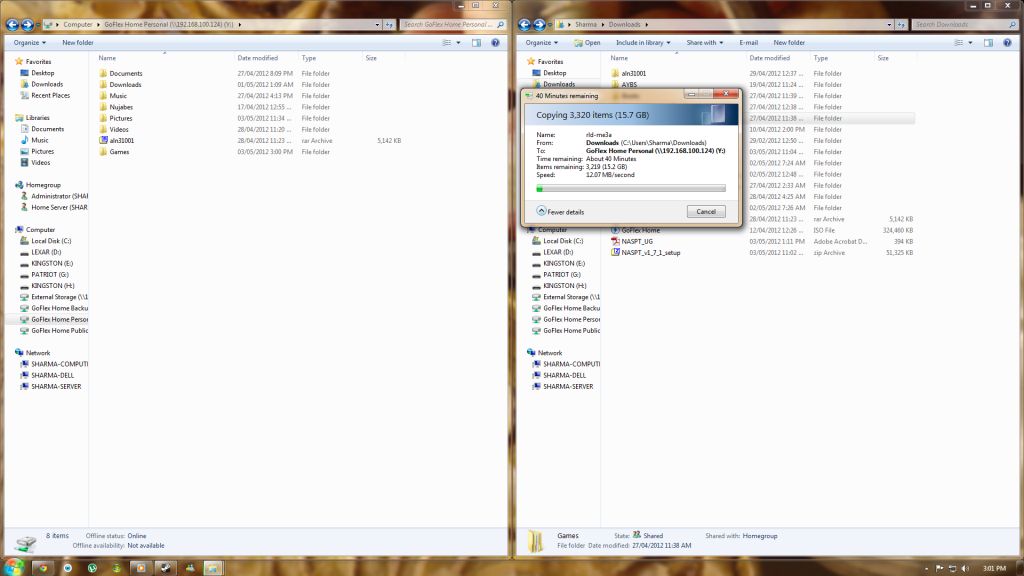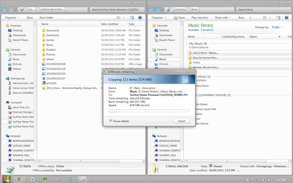 The file transfer was huge, roughly 330 Gb in size. As shown by the graph, the speed was rock solid, with extremely miniscule bumps in speed. I was expecting a network crash, loads of fluctuations in speed, and an overall painful experience getting that much data to transfer over. Thankfully, the GoFlex Home performed exceptionally throughout the entire process, while maintaining virtually the same speed as the hard-wired transfer: