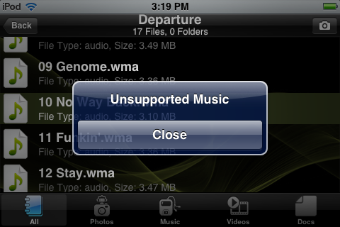 Now, I cannot complain too much about the app, as it is free, but I do have a few gripes with it. One major inconvenience is that not all file types are supported. It would be beneficial if the Seagate software/GoFlex Home supported live transcoding, because as it stands, in order to stream to your device, you need to convert a file for it to be compatible. If not, you are presented with a screen like the one below: